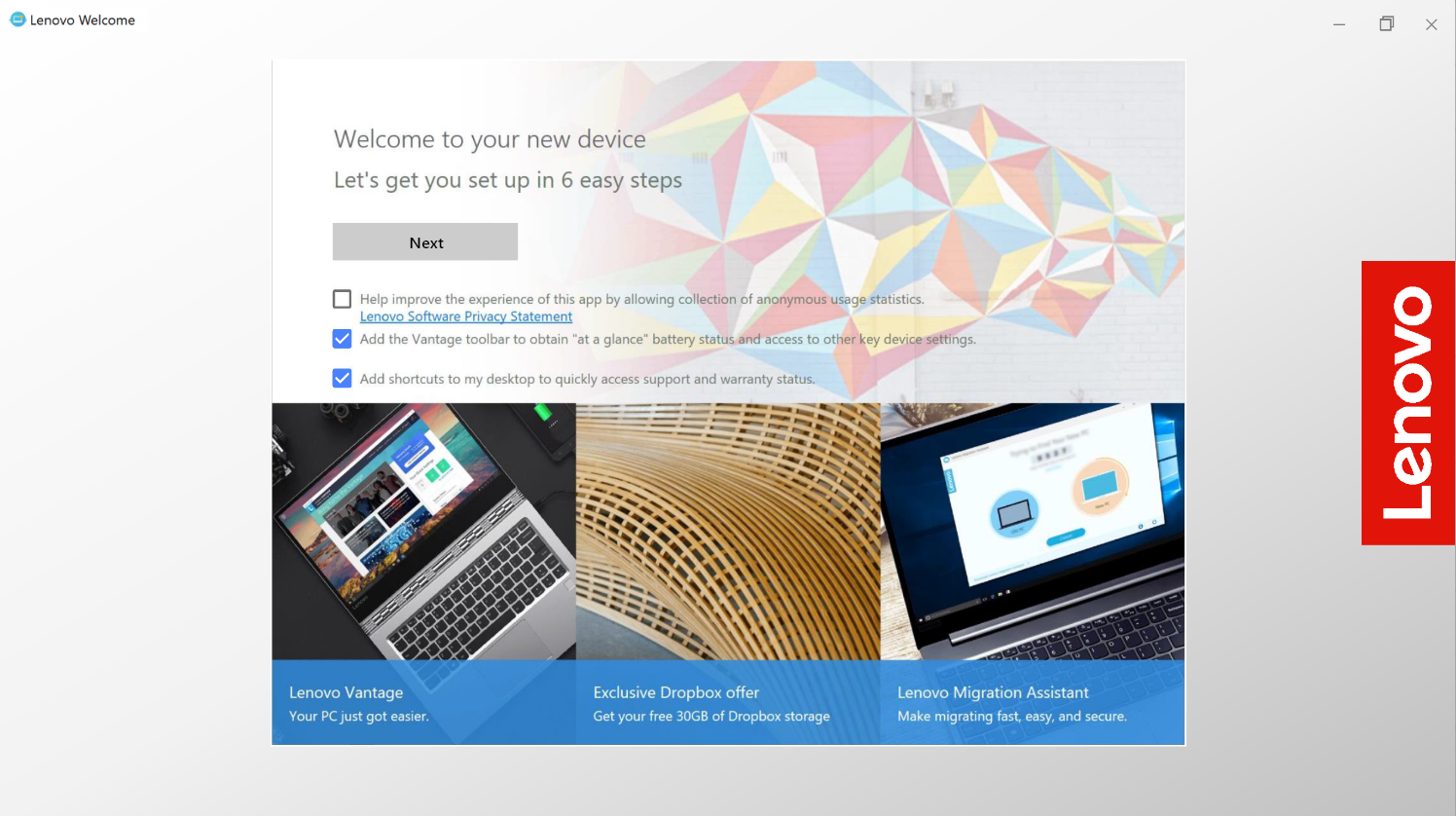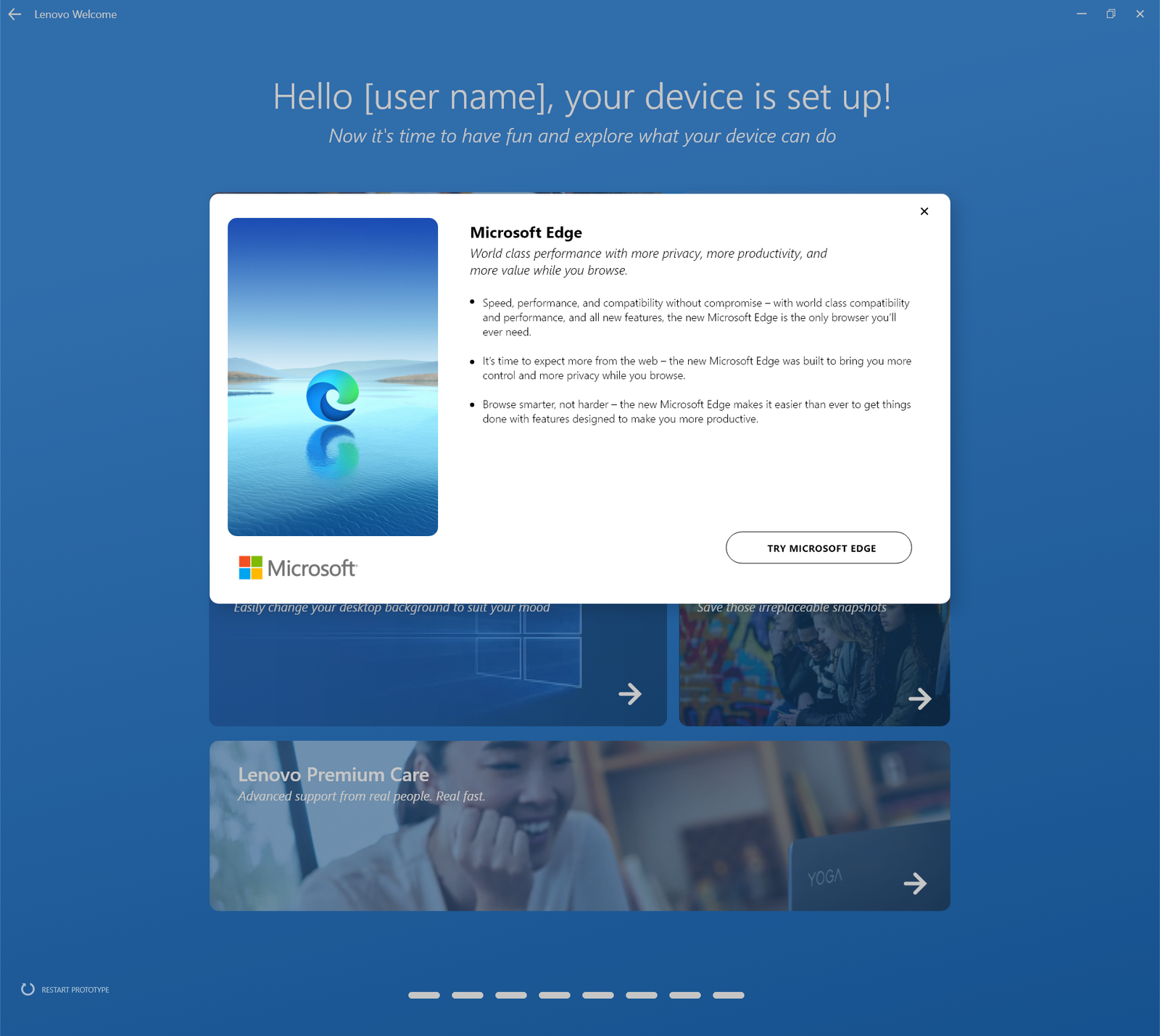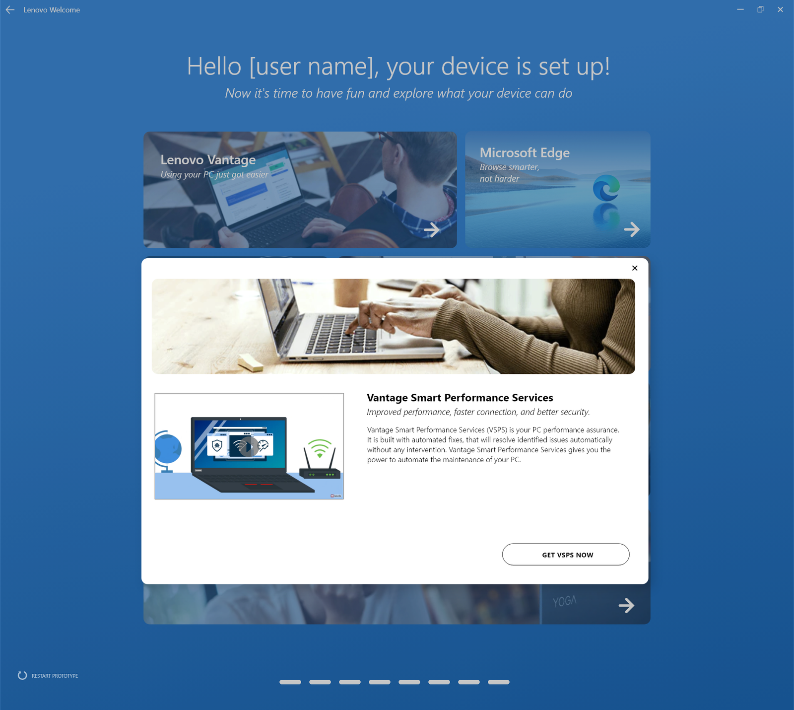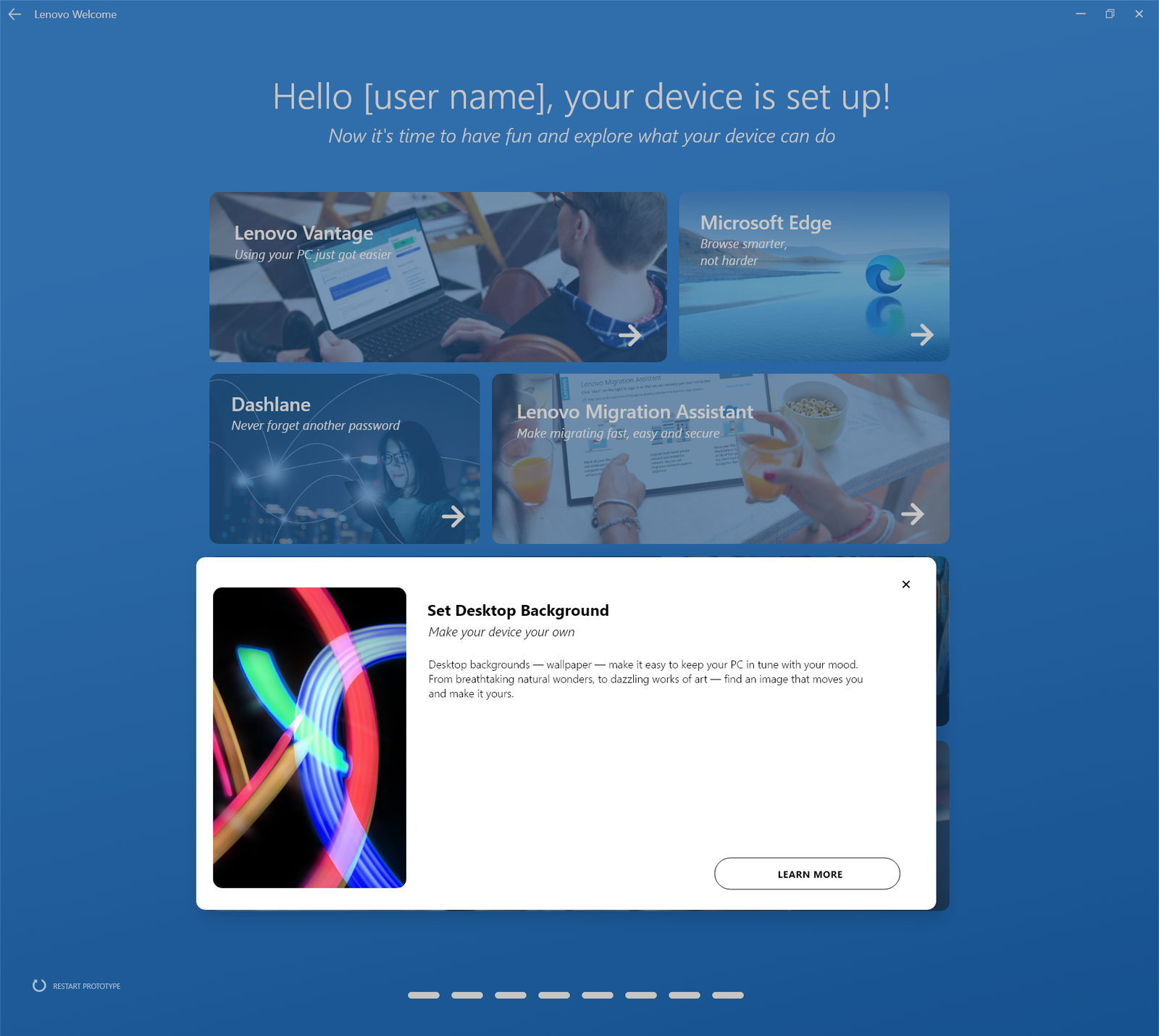 Additional testing before and after launch showed an improved customer experience compared to the original benchmarked experience. Lenovo Welcome is now a responsive experience that appears immediately after the Microsoft Onboarding, but the user is able to either complete or come back to Lenovo Welcome at their own time. Below are listed some improvements that have improved the experience.