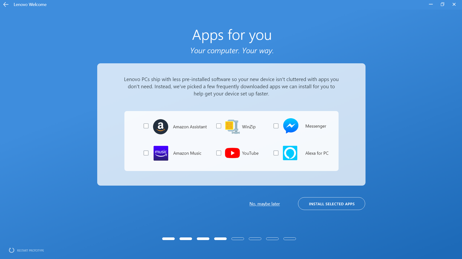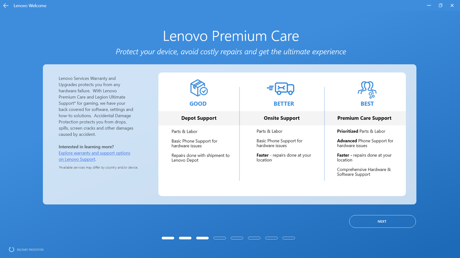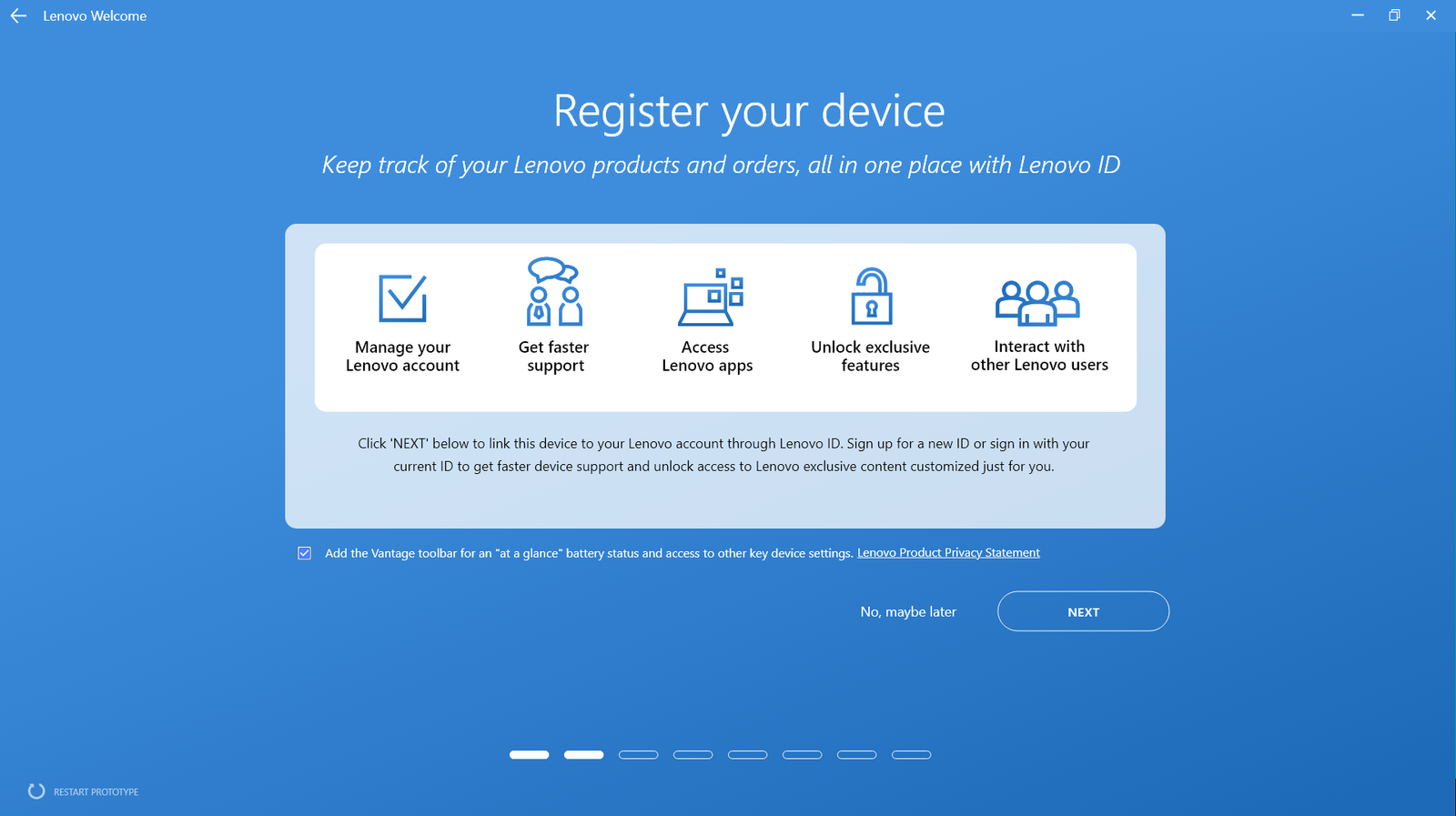 Additional testing before and after launch showed an improved customer experience compared to the original benchmarked experience. Lenovo Welcome is now a responsive experience that appears immediately after the Microsoft Onboarding, but the user is able to either complete or come back to Lenovo Welcome at their own time. Below are listed some improvements that have improved the experience.