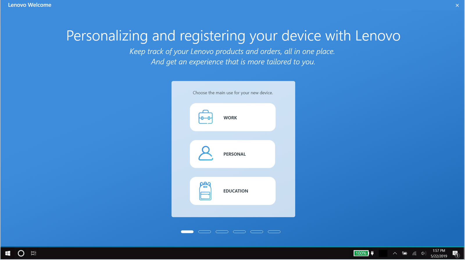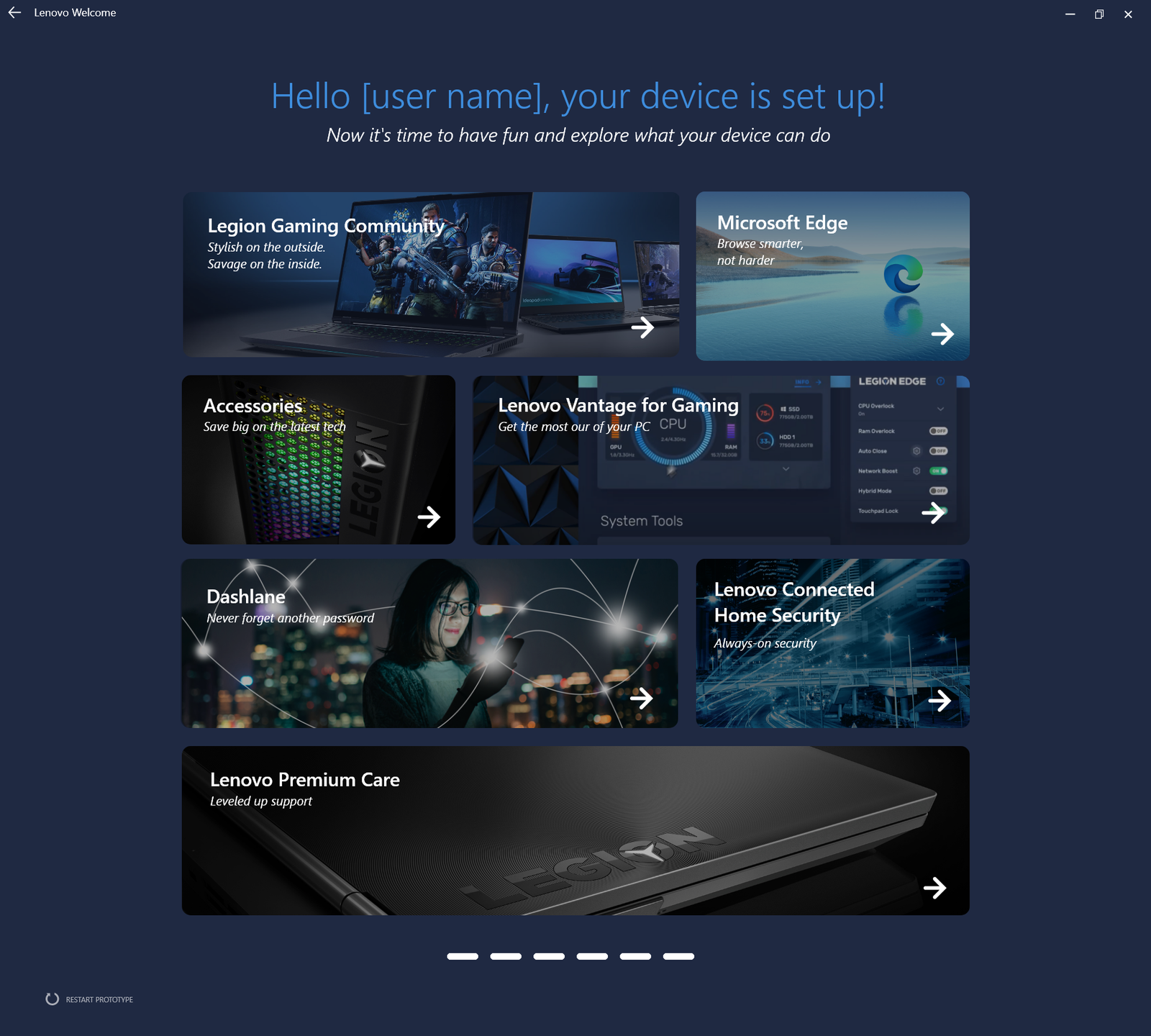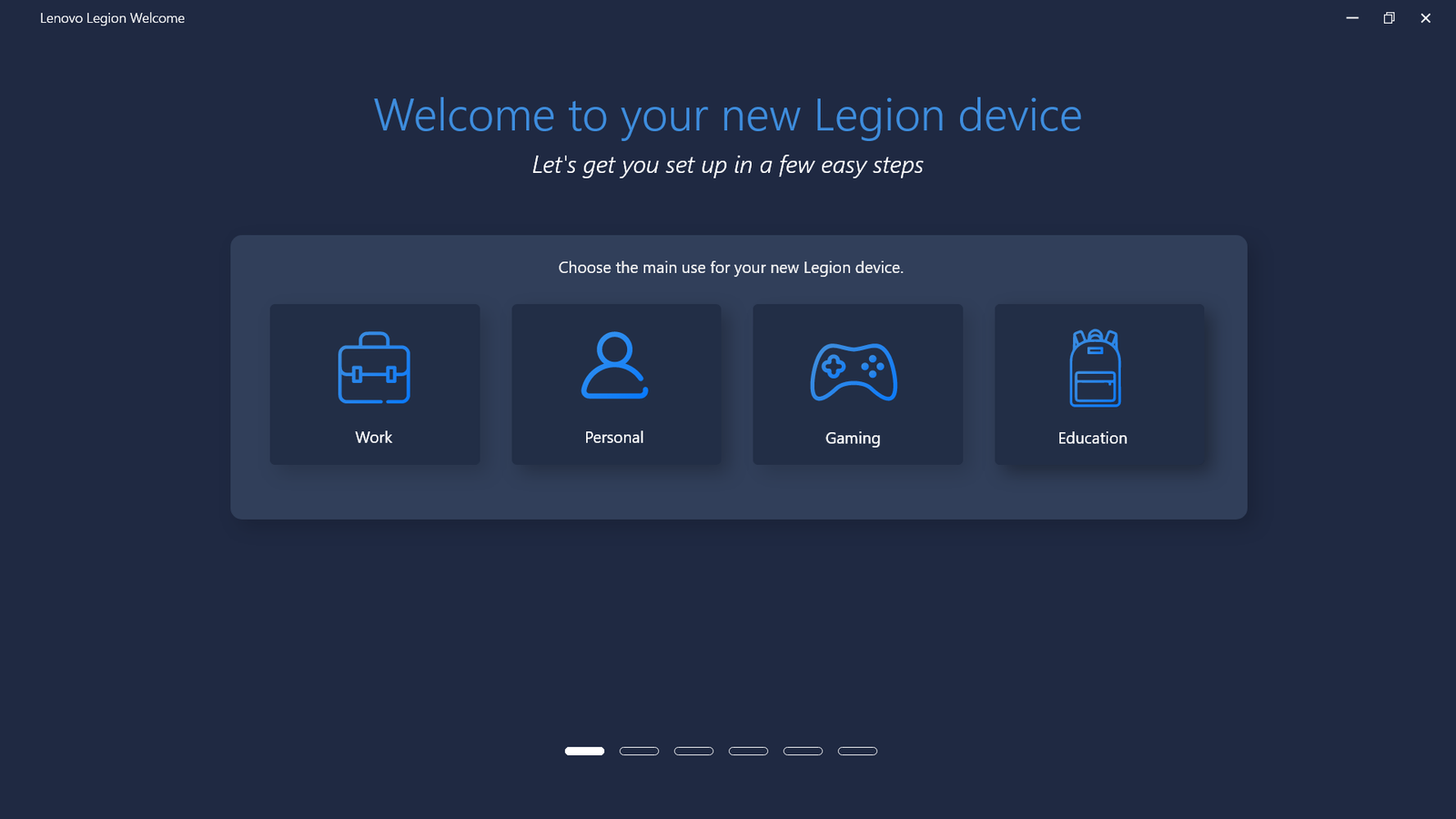 Below is the Legion flow and also the Personal, Work, and Educational flows that launched. Depending on the device the user has will depend on what type of experience they will receive. And then, once the user chooses what best describes how they will be using their device, is what type of offers and information will be shown to them, minus if they already have one of the applications or offers installed.