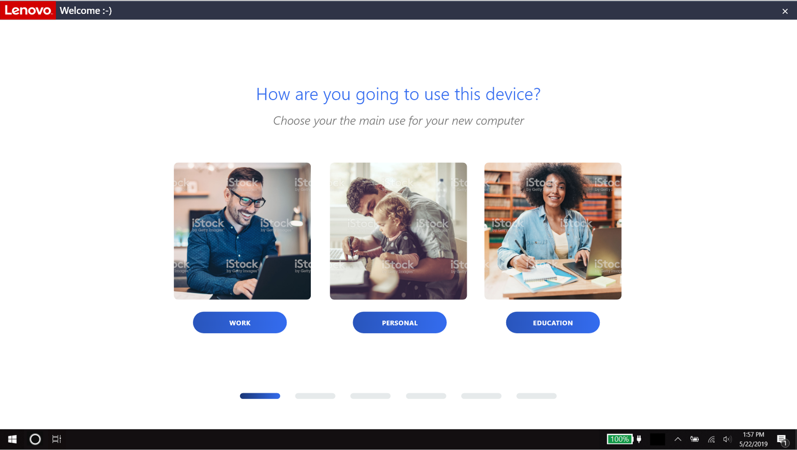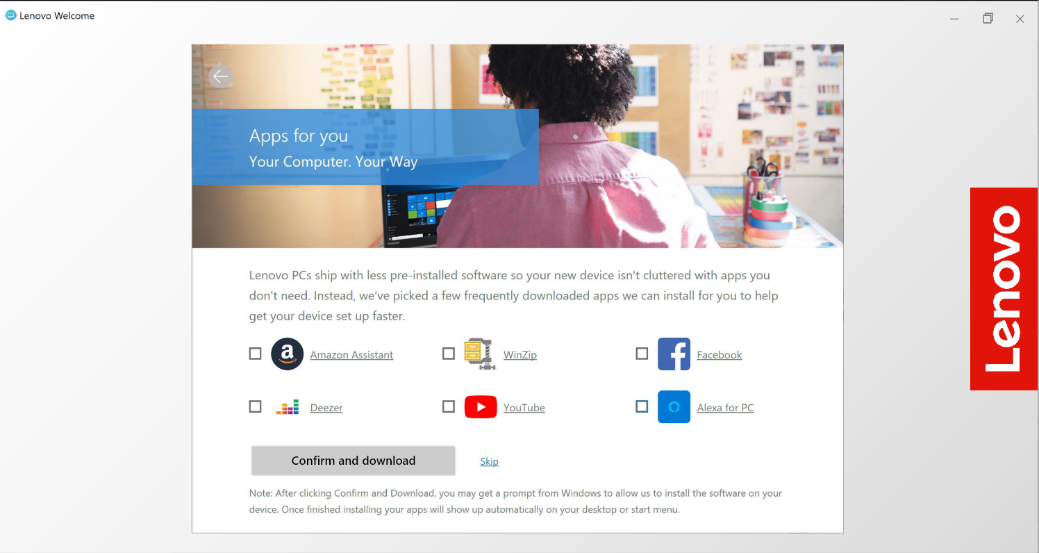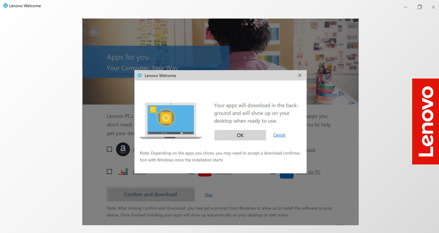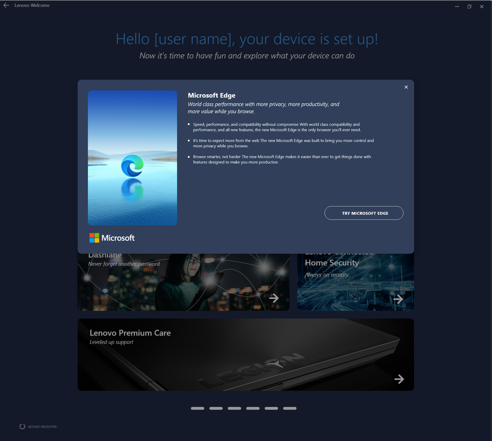 Lenovo Welcome is a pre-installed app on Lenovo devices, designed to introduce users to their new device with guided tutorials, setup instructions, and personalized recommendations. It appears when you first set up a Lenovo laptop or desktop after the Microsoft first run experience. It serves as an onboarding tool, helping users configure their settings and learn about their device’s features. It may also suggest Lenovo services, apps, and promotions tailored to the device type and personas. Lenovo sells over 60 million units annually and an estimated 400K activations daily.