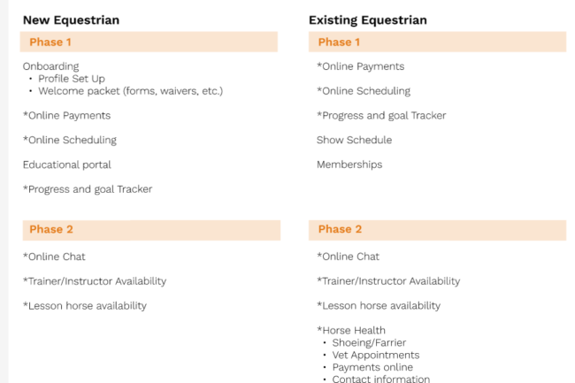 Based on the research data, there are many features that would benefit the user, but I had to scope the product features in phases. Through the research, there were also other personas that I found that had similar but different needs from a business perspective. This was well beyond the scope of the first phase. The additional personas would be barn owners, trainers, and riding instructors.